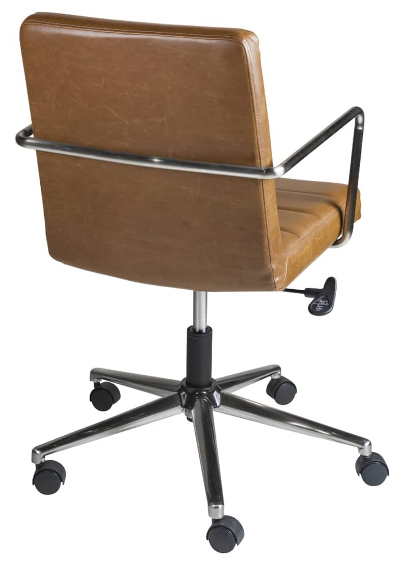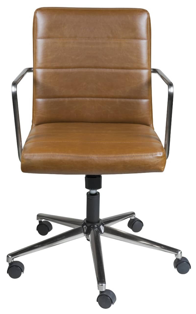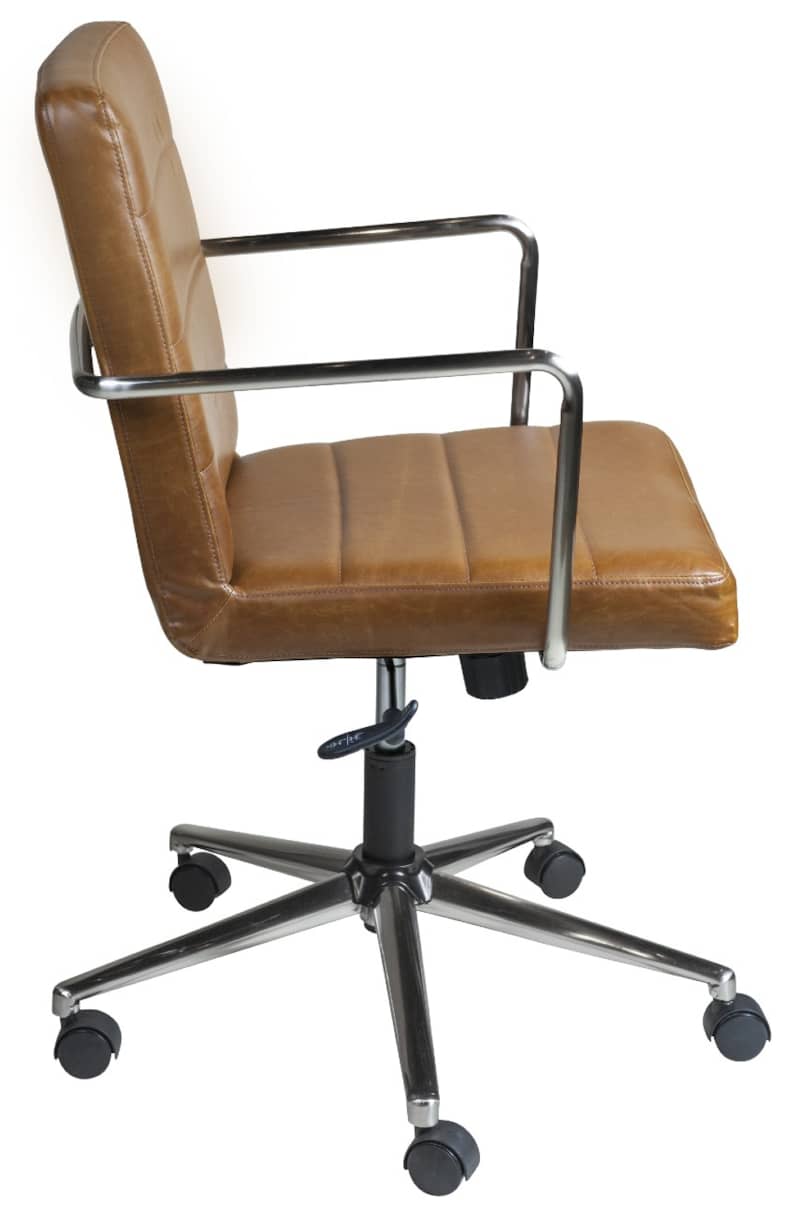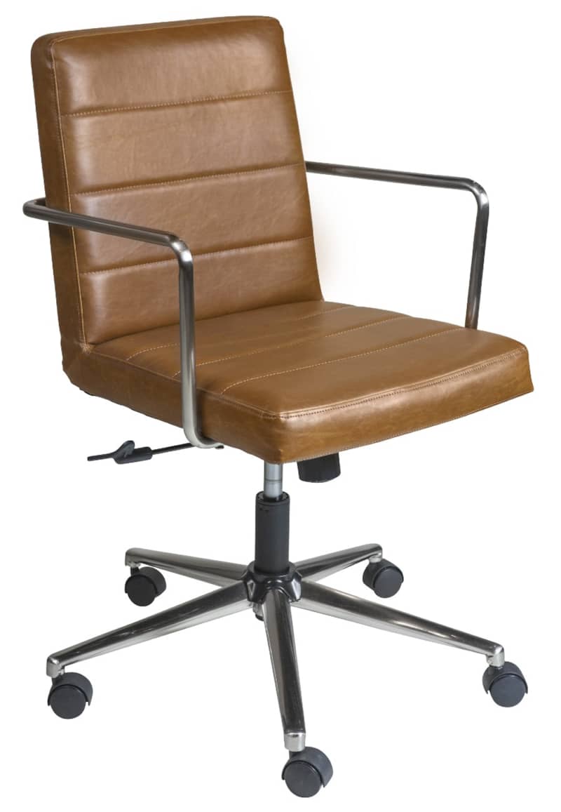 Euro Style 01283BRN Brown Leander Low Back Office ChairThe Leander Collection features vintage soft leatherette upholstered seat and back, brushed nickel plated steel armrests and base with nylon casters. It comes with tilt mechanism that locks in upright position. Features