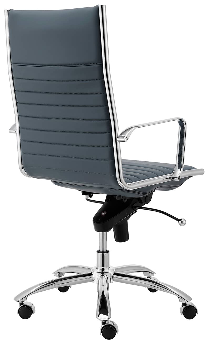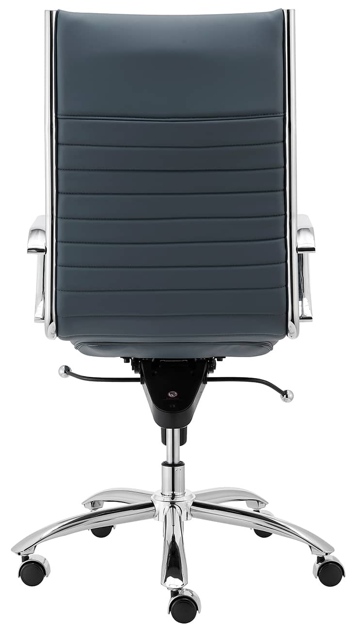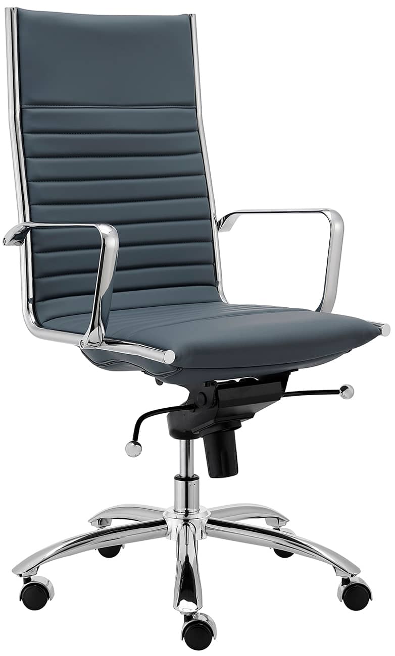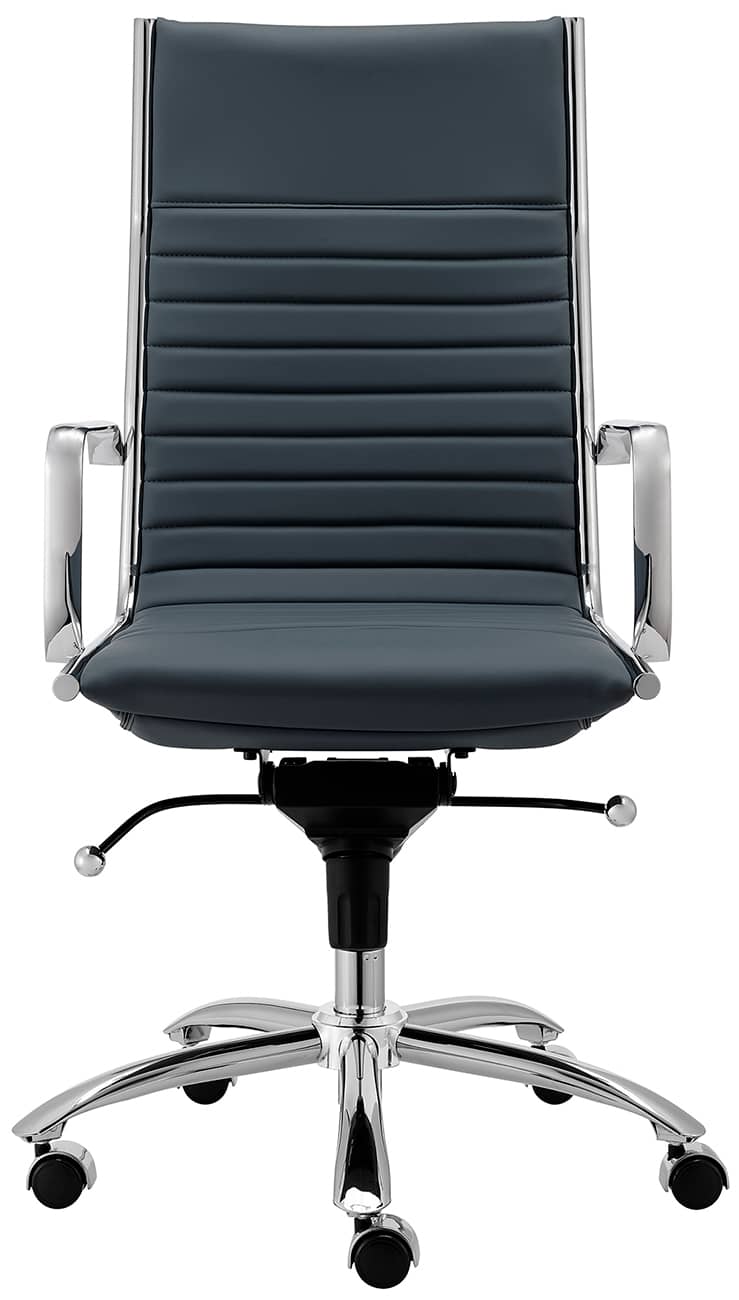 Euro Style 00675BLU Dirk High Back Office Chair in Blue w/ Chromed Steel BaseHigh back or low, armrests or not, the Dirk Office Chair design is very popular for all the right reasons. The seat and back are constructed into a single piece for a finished look, while inside the seat and back are flat bungie bands which offer an outstanding level of comfort that is famous worldwide. With stunning design and a variety of color options, the Dirk is perfect for any office space. Features