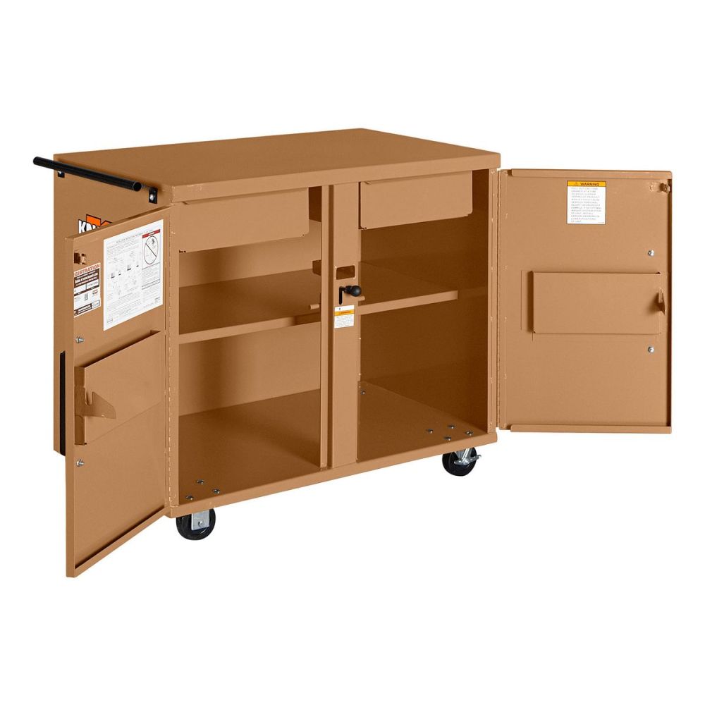 The Model 40 JOBMASTER® Rolling Work Bench, 800 pound capacity, is the versatile and tough-as-nails storage bench on wheels that helps you get the job done with efficiency. Measuring 25 inches wide and 40.75 inches long with a load capacity of 800 pounds, you’ll have ample work space on the top surface, not to mention maximum strength for any job and any trade. This KNAACK® workbench includes a 4-inch caster set (two swivel and two rigid), along with two heavy-duty drawers rated each for 50 pounds and a full-width welded shelf for organized storage of tools and equipment. The WATCHMAN® IV Lock System will protect tools and equipment from theft and easily unlock to give you access. The KNAACK workbench has a powder-coat finish as well as a heavy-duty 16-gauge steel construction to limit wear and tear and maximize durability.