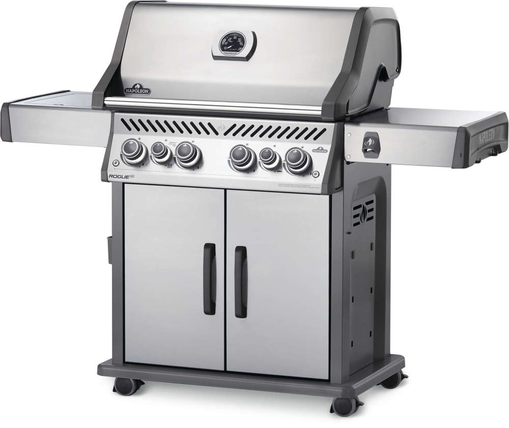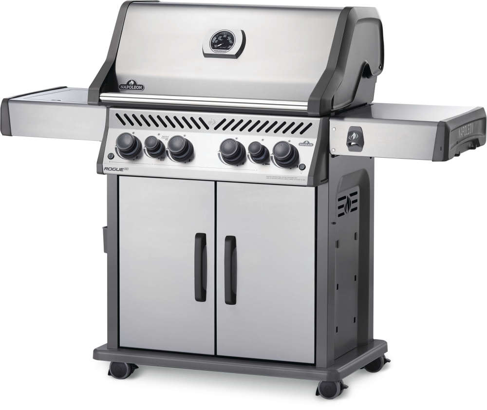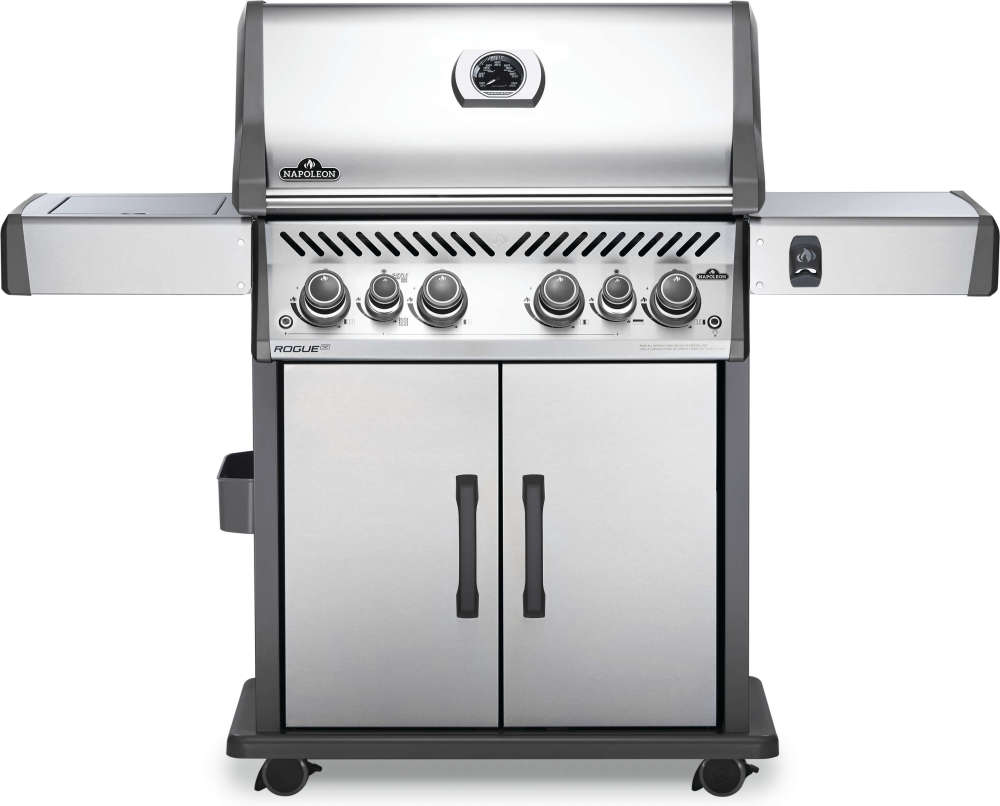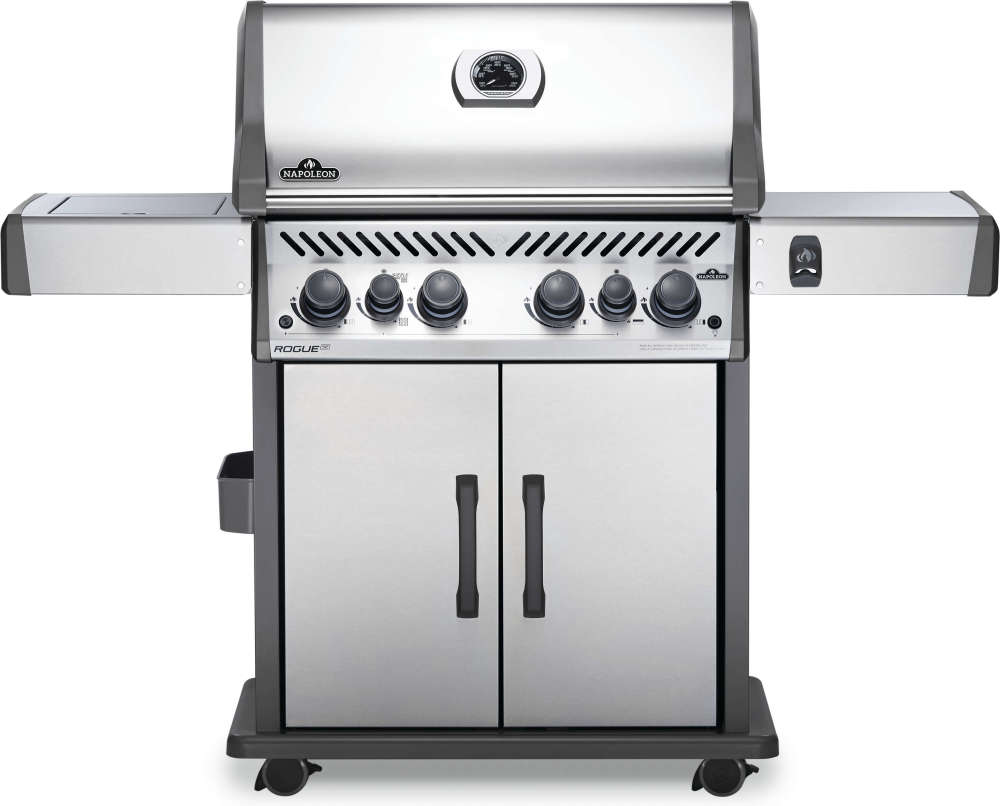 The Napoleon Rogue® SE 525 Stainless Steel Natural Gas Grill with Infrared Side Burner and Rear Burner is a durable stainless steel grill. Featuring four main burners, a rear rotisserie burner, and a high top lid, this grill has everything you need to create gourmet meals. Sear restaurant-style steaks on the sizzle zone side burner, while generous side shelves provide plenty of prep space. Rogue® SE models boast exclusive features including an integrated bottle opener, a high-top lid, and a sleek new control panel with backlit, ergonomic knobs. No other grill gives you such versatility with an affordable price and high-quality components. So get out there and grill different. Go, Rogue.
